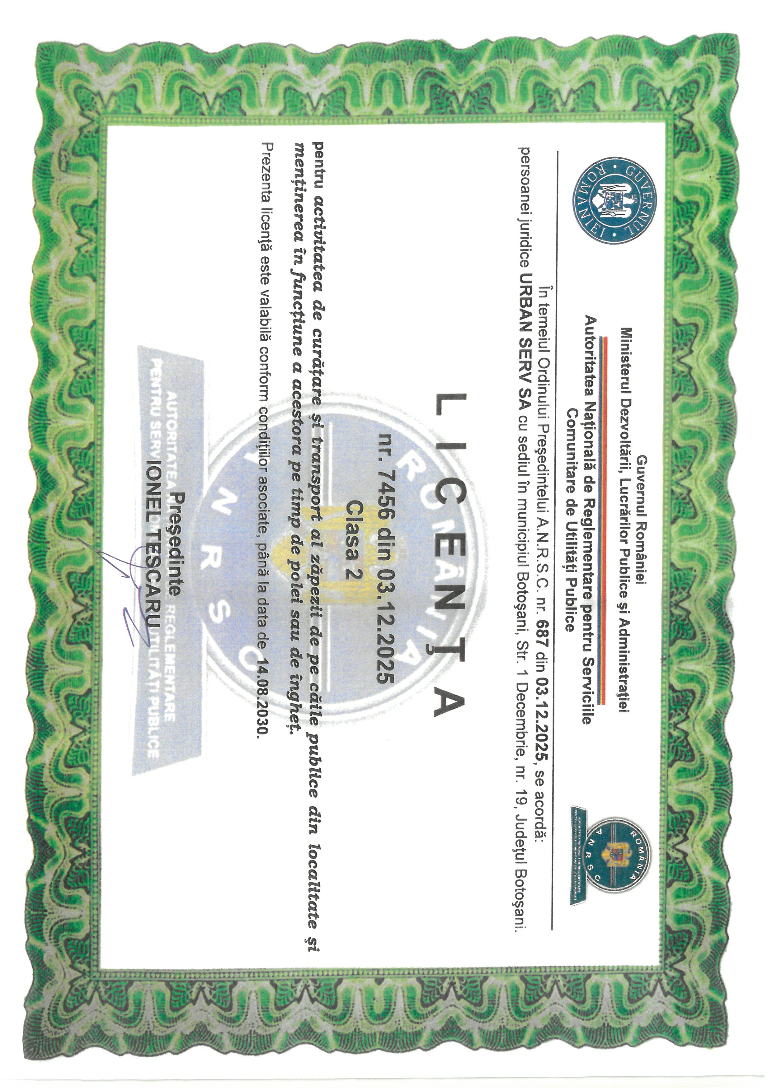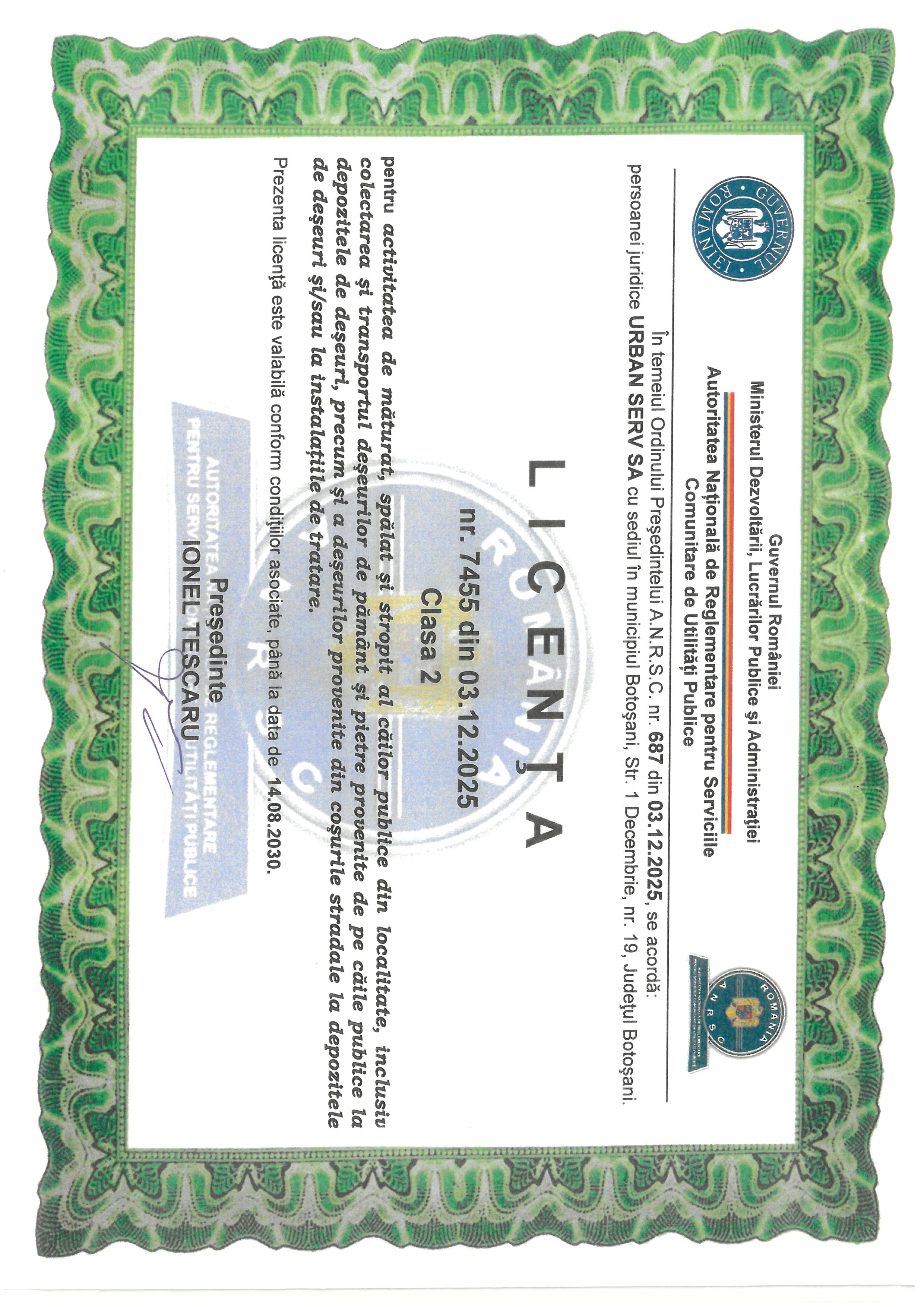 Operatorul de salubritate Urban Serv SA Botoșani deține licențe clasa 2 eliberate de ANRSC și certificate de înregistrare pentru recunoașterea sistemelor de management implementate pe standardele ISO 9001:2015, ISO 14001:2015 și ISO 45001:2018.